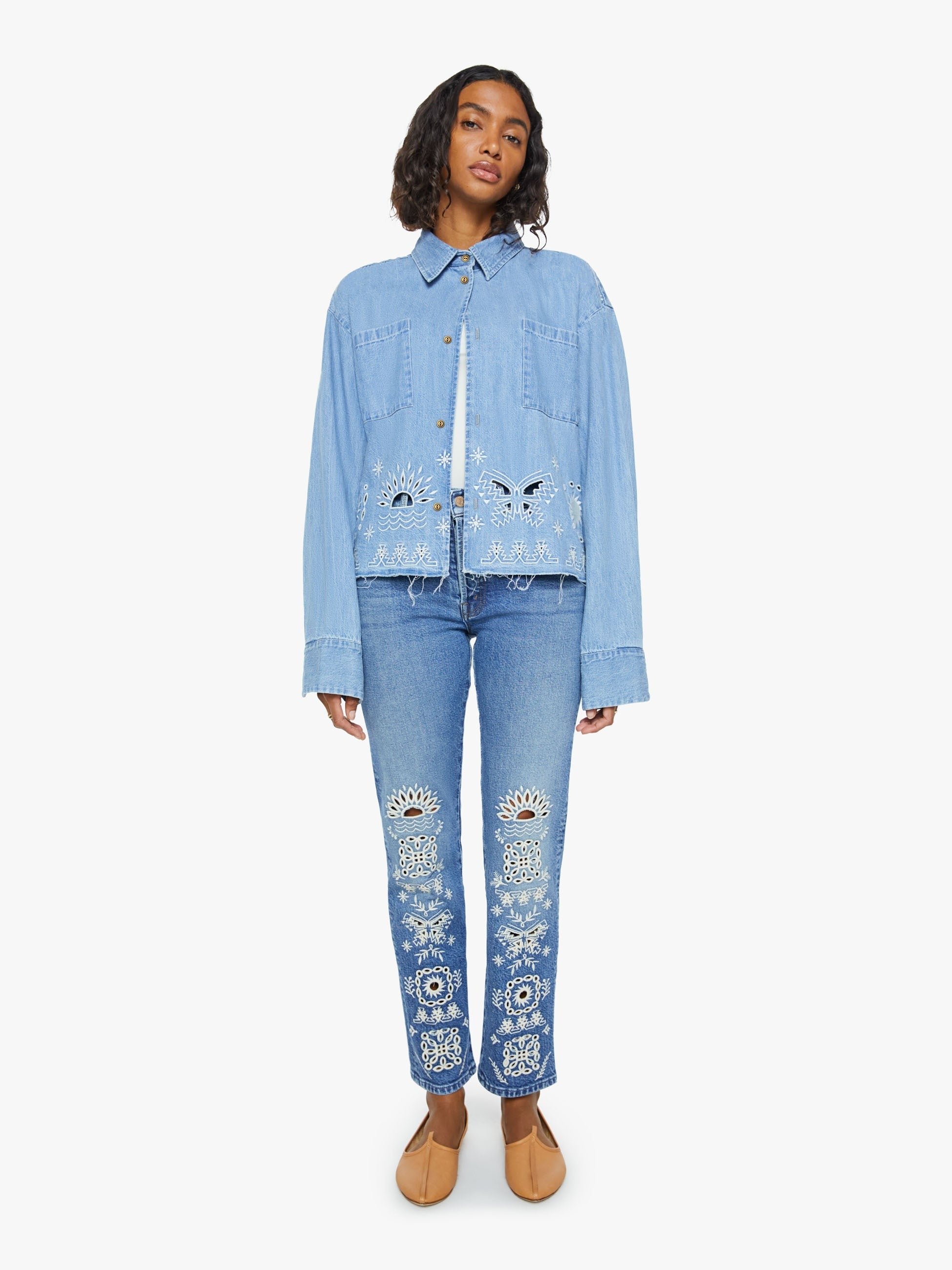 - A denim button-up with drop shoulders