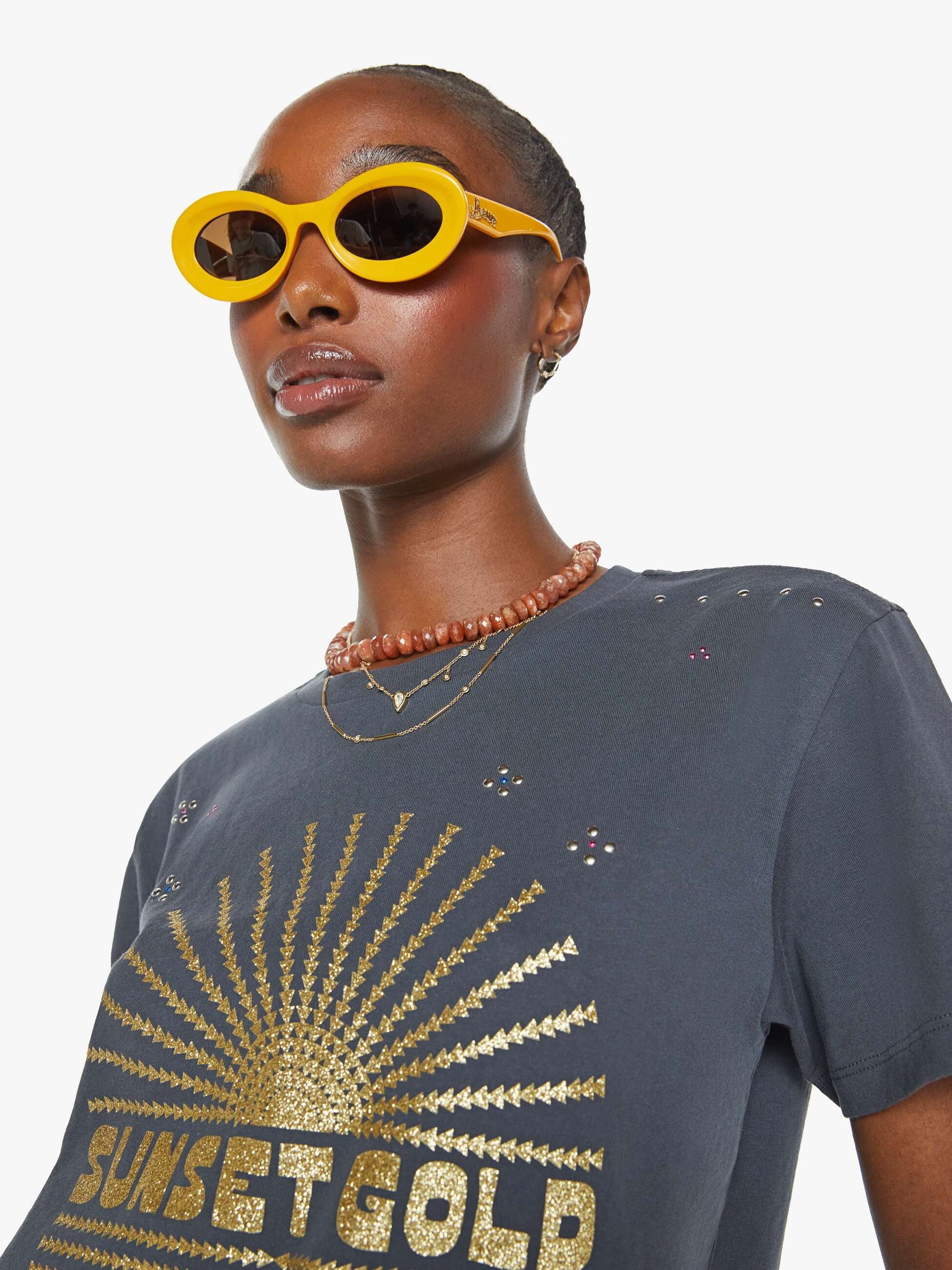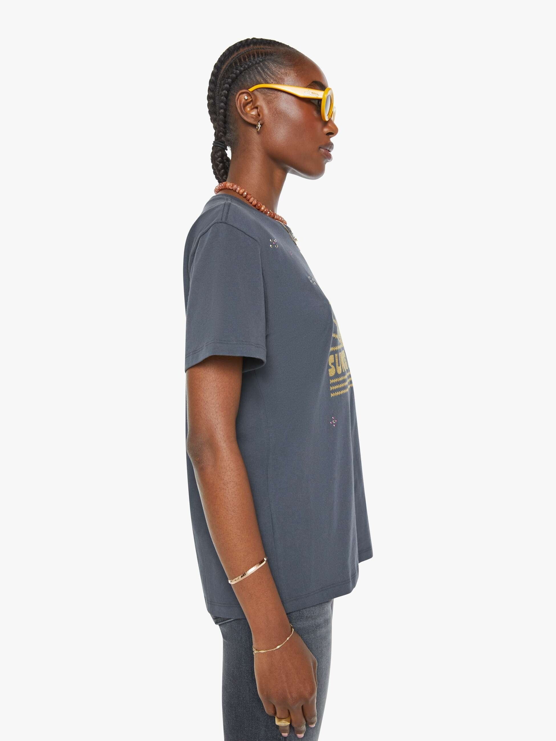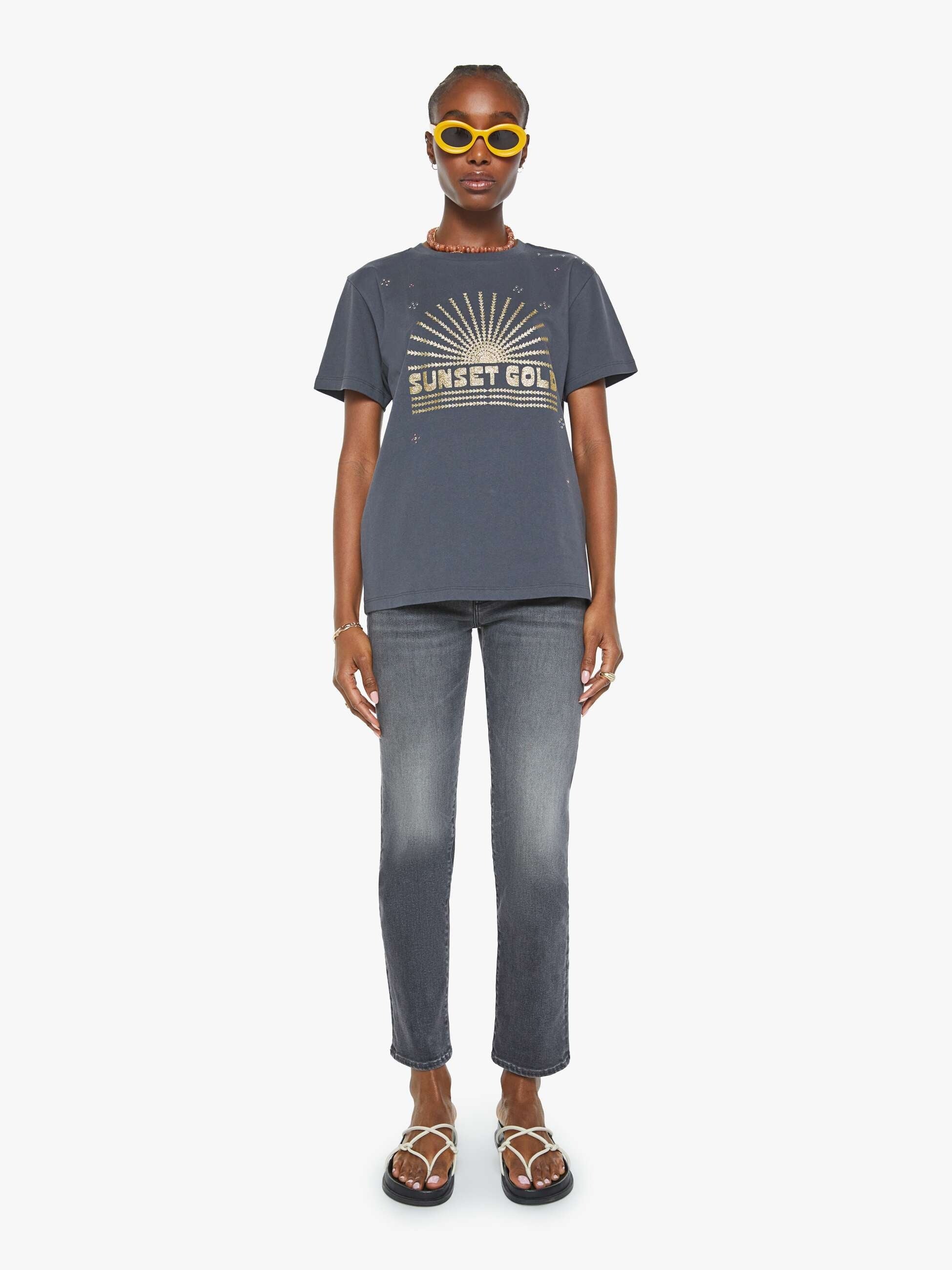 • Faded black tee featuring a sunset graphic in metallic gold and rhinestones